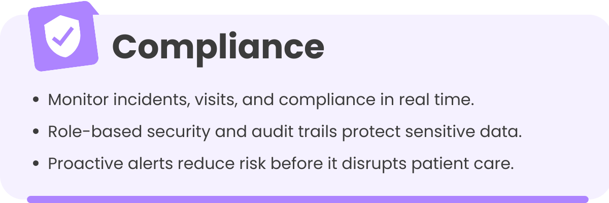 CareVoyant Solution: Integrated Operational Efficiency dashboards track KPIs like missed visits, patient incidents, and care compliance in real time. Role-based access and audit trails strengthen data security, while automated alerts allow administrators to mitigate risks proactively.