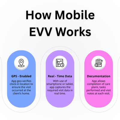 Mobile EVV is a GPS-enabled electronic visit verification system that allows caregivers to clock in and out via a smartphone or tablet, ensuring accurate, real-time visit verification and eliminating paper timesheets.